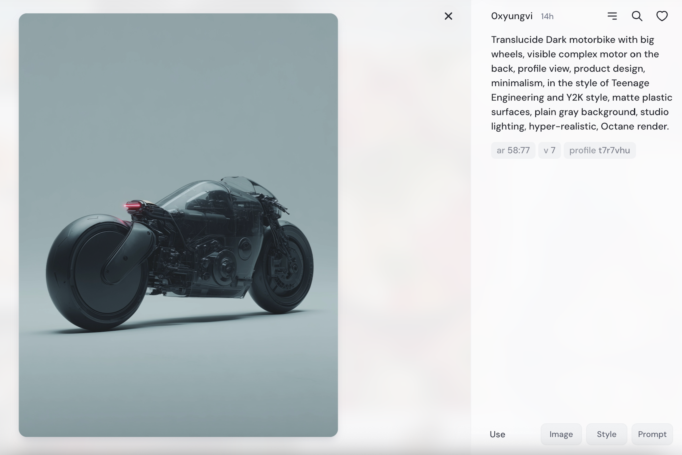 Imagine an industrial designer exploring a translucent, matte-black motorcycle, minimal, exposed, engineered like a piece of future tech. Every internal mechanism visible. Without AI, she’d spend hours, maybe days, modeling and rendering just a single variation.